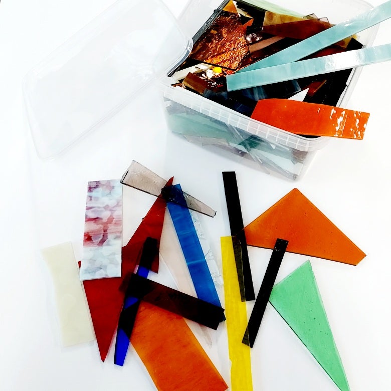 Kilopalalaatikot sisältävät 2,5 kilon painon verran erilaisia lasimosaiikki- ja tiffanytyökäyttöön soveltuvia laseja. Lasit ovat rikkoutuneista levyistä, omista lasitöistämme sekä lasilevyjen reunoista jääneitä paloja ja soiroja. Kaiken muotoisia ja kokoisia, osa hyvinkin pieniä.