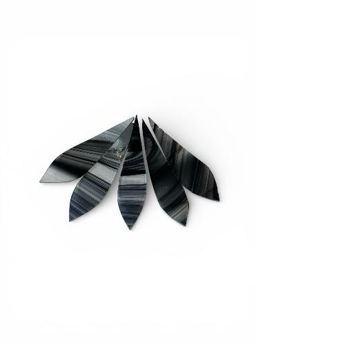Valmis lasilehti tuo näyttävyyttä ja viimeisteltyä ilmettä Tiffany- ja muihin lasitöihin. Lehdessä on kaunis mustan ja harmaan sävyinen raidallinen kuviointi, joka luo elävän ja luonnollisen vaikutelman. Jokainen lehti on yksilöllinen lasin kuvioinnin ansiosta.